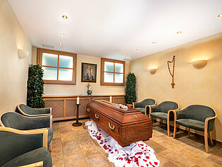 In unserem Verabschiedungsraum haben Sie die Möglichkeit, sich am offenen Sarg von Ihrem lieben Verstorbenen zu verabschieden. In aller Stille oder bei sanfter Musik können Sie im Kreise Ihrer Familie an schöne Ereignisse zurückdenken und auf Wunsch kirchlichen Beistand den Segen einholen.