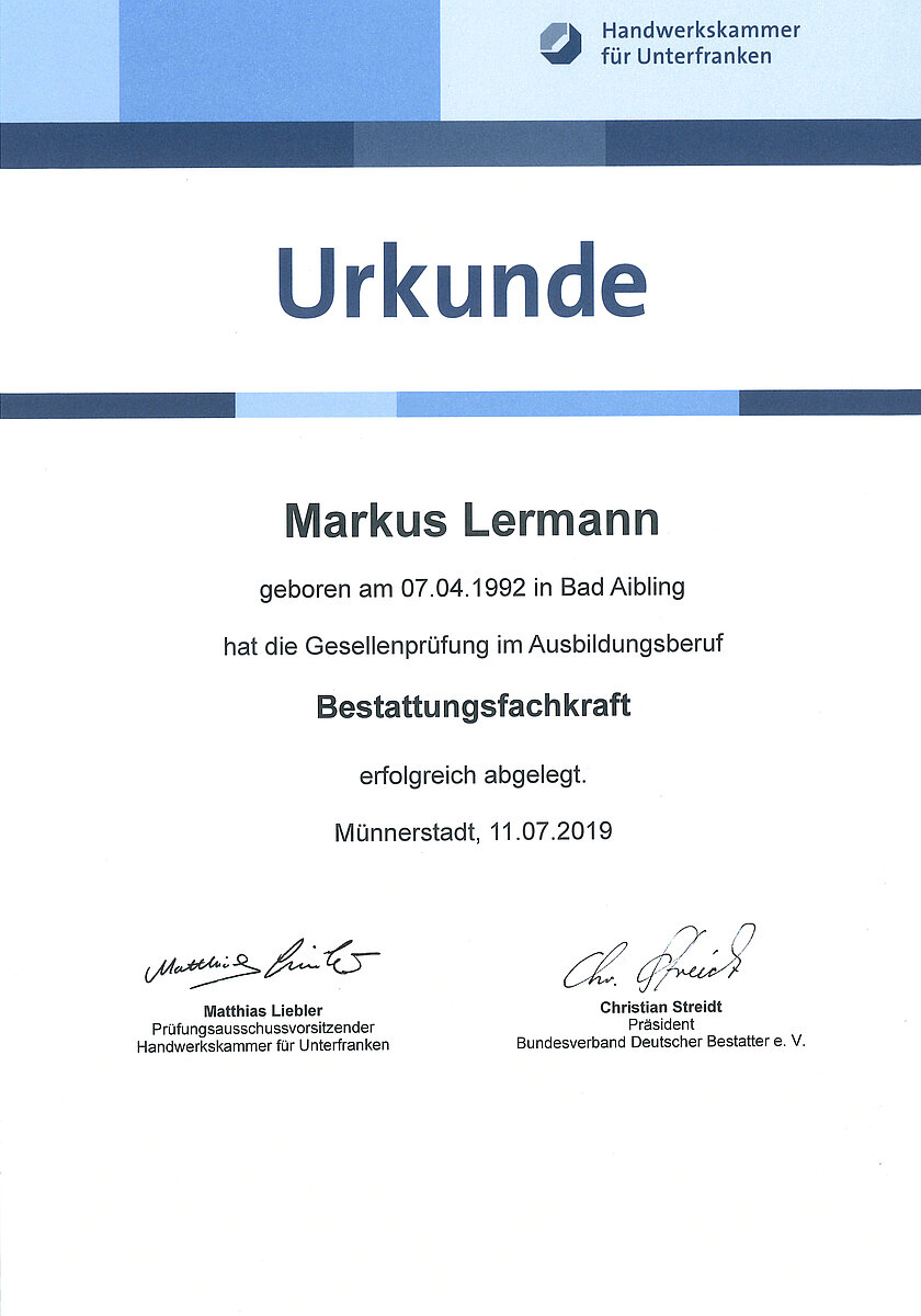 Georg Hartl Bestattungen nimmt in der Region eine herausragende Stellung ein bei der Qualifikation von MitarbeiterInnen und der beruflichen Ausbildung. Im Unternehmen setzen wir vor allem auf qualifizierte Bestattungskräfte, die entweder eine Ausbildung zur Bestattungsfachkraft, zum Geprüften Bestatter oder zum Bestattermeister absolviert haben.